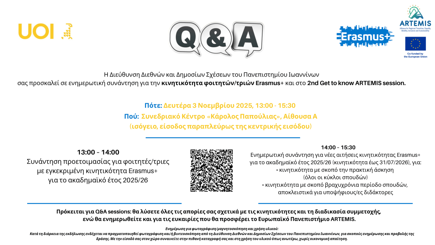η Διεύθυνση Διεθνών και Δημοσίων Σχέσεων διοργανώνει Ενημερωτική Συνάντηση (Q&A) Erasmus+/ARTEMIS για φοιτήτριες και φοιτητές,
