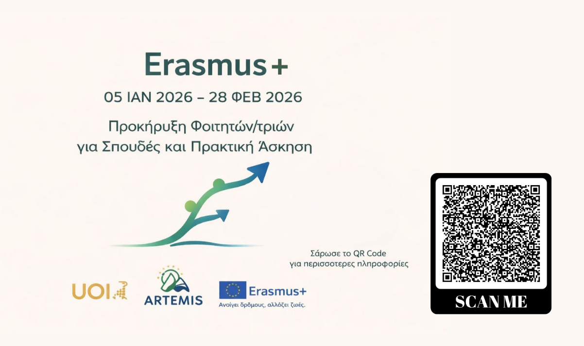 Η Διεύθυνση Διεθνών και Δημοσίων Σχέσεων του Πανεπιστημίου Ιωαννίνων ανακοινώνει ότι στις 5 Ιανουαρίου 2026 θα δημοσιευτεί η Προκήρυξη Φοιτητών/τριών Erasmus+ για Κινητικότητα με σκοπό τις Σπουδές και την Πρακτική Ασκηση, στο πλαίσιο του Σχεδίου 2025.